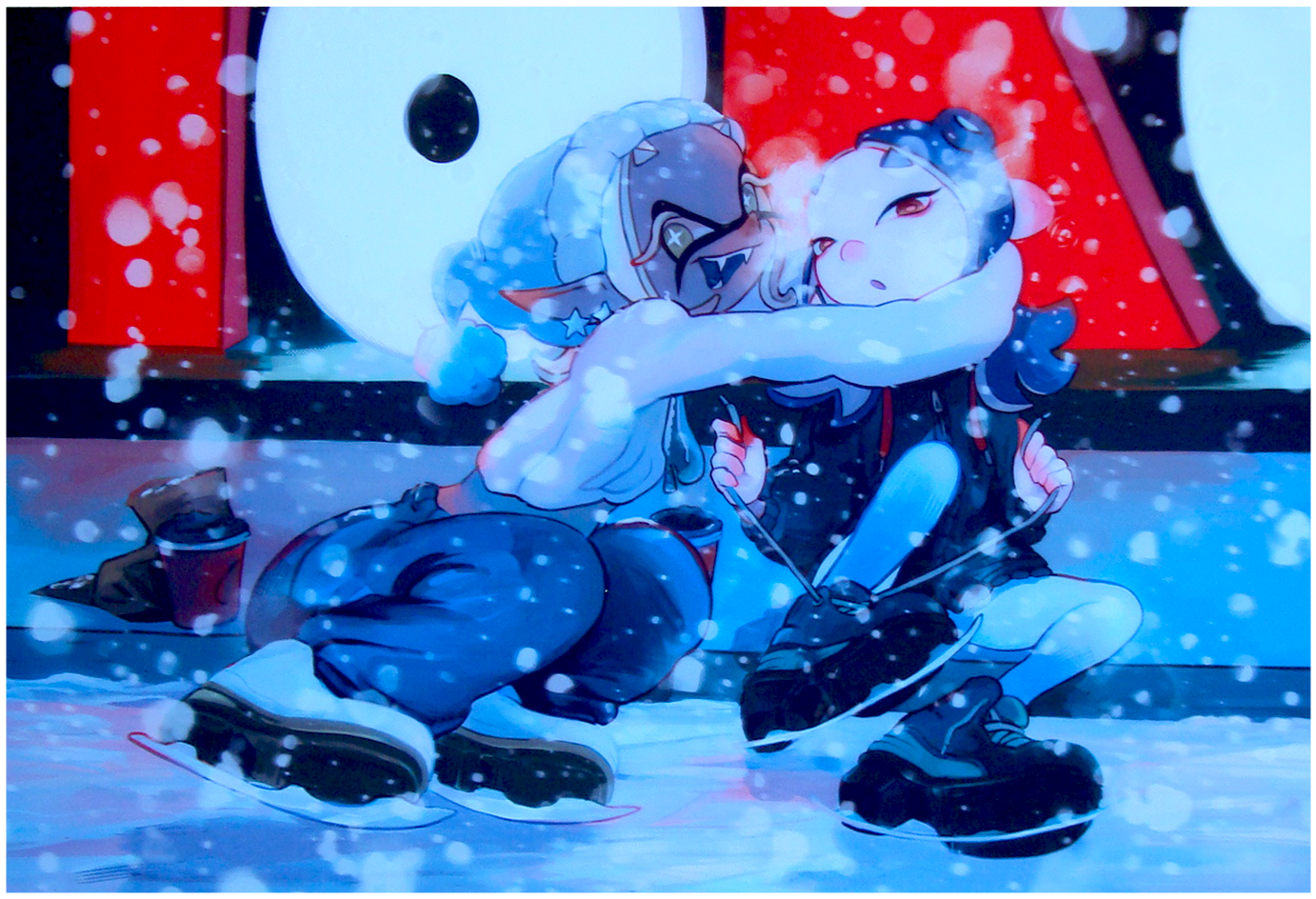 One of the three paintings for Toronto's first competitive Splatoon LAN "Torontoroka"! This painting features Frye and Shiver getting ready to skate at the Nathan Phillips Square rink in front of the Toronto sign.